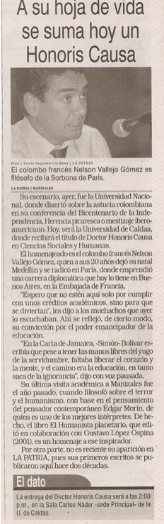 Su escenario ayer fue la Universidad Nacional donde Nelson Vallejo Gómez disertó sobre la astucia colombiana en su conferencia del Bicentenario de la Independencia, Herencia Picaresca o Mestizaje iberoamericano. Hoy será la Universidad de Caldas la que le otorgue el título de Doctor Honoris Causa en Ciencias Sociales y Humanas. «Espero que no estén aquí por cumplir con unos créditos académicos», les dijo a los muchachos que ayer lo escuchaban. Ahí se reflejó, de cierto modo, su convicción por el poder emancipador de la Educación.