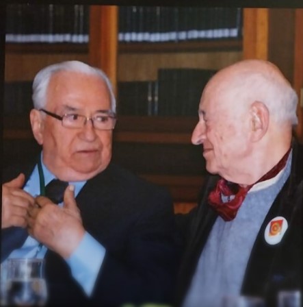 Marco Antonio Velilla Moreno (izq.) y Edgar Morin, cantando en Bogotá, «A mis amigos» de Alberto Cortés. (Foto: Brigitte LEGENDRE)
